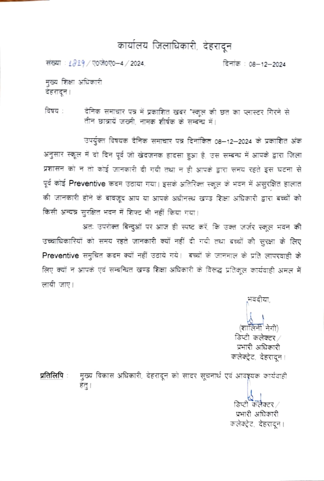 जिलाधिकारी ने मुख्य शिक्षा अधिकारी तथा खंड शिक्षा अधिकारी का शोकॉज देते हुए तलब करते हुए जवाब मांगा कि स्कूल की मरम्मत क्यों नही की गई, कक्षा जर्जर होने की दशा में बच्चों को अन्यत्र स्कूल में कक्षा में शिफ्ट क्यों नहीं किया गया । उन्होने सभी खंड विकास अधिकारी तथा खंड शिक्षा अधिकारियों को निर्देशित किया कि वह अपने-अपने क्षेत्र में स्कूलों के जर्जर भवन, स्कूलों की मरम्मत, जर्जर भवन होने की दशा में अन्यत्र शिफ्ट किए गए बच्चों की संख्या, के संबंध में प्रमाण पत्र प्रस्तुत करेंगे। जिलाधिकारी ने सख्त निर्देश दिए हैं कि इस प्रकार की घोर लापरवाही क्षम्य नहीं होगी. इस प्रकार की प्रकार की घटना दोबारा ना हो इसके लिए सभी स्कूलों का सर्वेक्षण करते हुए निर्धारित प्रारूप पर अपनी रिपोर्ट प्रस्तुत करें।
