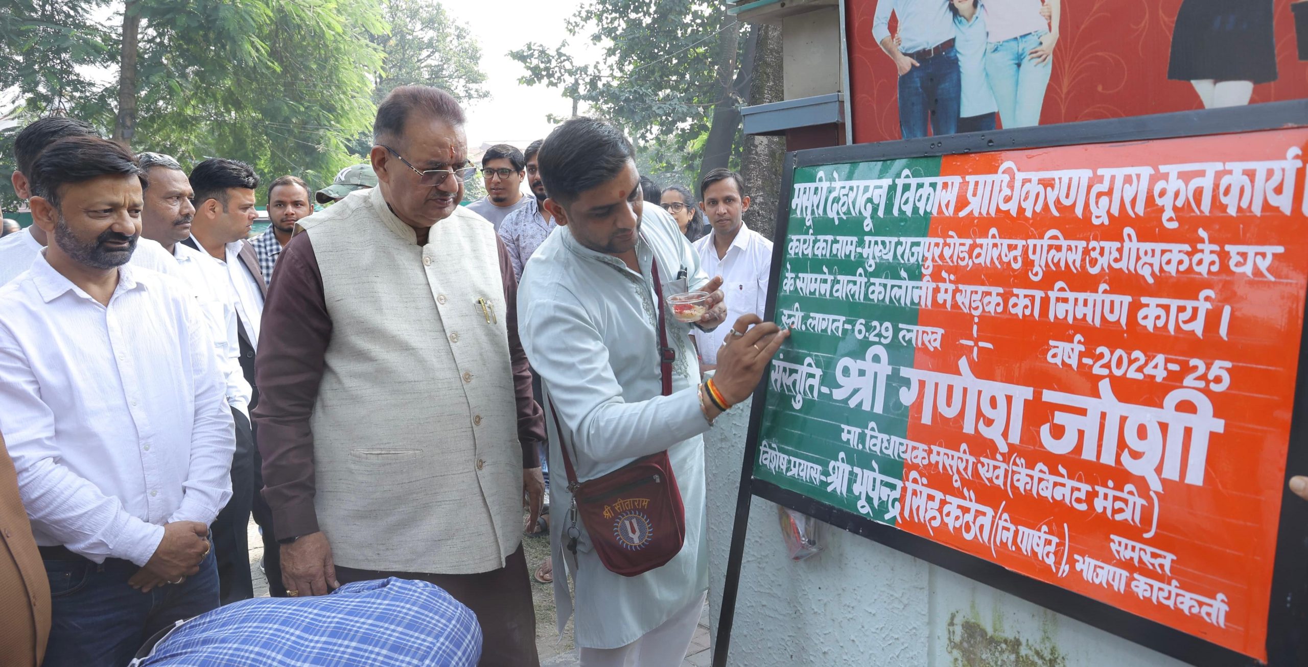 देहरादून, 21 अक्टूबर। कैबिनेट मंत्री गणेश जोशी ने सोमवार को मसूरी देहरादून विकास प्राधिकरण द्वारा स्वीकृत मसूरी विधानसभा क्षेत्र के अंतर्गत देहरादून के राजपुर रोड़ स्थित वरिष्ठ पुलिस अधीक्षक के आवास के सामने वाली कॉलोनी में स्वीकृत लागत ₹6.29 लाख की लागत से तथा मुख्य राजपुर के ढाकपट्टी में लागत ₹ 7.76 लाख से सी.सी.सड़क निर्माण कार्यों का भूमि पूजन किया। इस दौरान कैबिनेट मंत्री गणेश जोशी ने एमडीडीए के अधिकारियों को निर्माण में सामग्री की गुणवत्ता का विशेष ध्यान देने और निर्धारित समय सीमा के भीतर निर्माण कार्य पूर्ण करने के भी निर्देश दिए। उन्होंने कहा कि प्रदेश की धामी सरकार आम जनमानस की भावनाओं के अनुरूप कार्य कर रही है। उन्होंने कहा कि हमारी सरकार सबका साथ सबका विकास और सबका विश्वास नारे के ध्येय वाक्य के साथ ही आमजनमास को मूलभूत सुविधाओं को सुदृढ़ करने की दिशा में निरंतर प्रयासरत हैं।