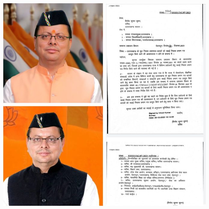 मुख्यमंत्री धामी के निर्देशों के क्रम में सचिव की ओर से किये गए आदेश जारी,मूल निवास प्रमाण-पत्र धारकों को अब स्थाई निवास प्रमाण पत्र बनाने की बाध्यता नहीं होगी